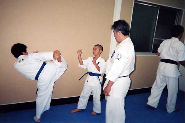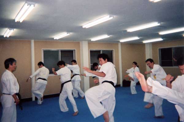 初日は準備運動から順に始まり、それぞれの動作についての意味を詳しく解説、悪い例とよい例を示しながら指導が進んでいった。師範が直接やって見せていただける為大変判り易く、参加者は普段行っている動作が中途半端だった事に気づき、あらためて準備運動の大切さを認識した。基本稽古に移り、それぞれ技の特徴と注意点を細かく指導された。空手の基本、拳の握り方から立ち方、目の配り方に始まり、肘の使い方と膝の使い方、重心移動の重要性など微に入り細を穿った説明が続き、ご自身の知っていることを全て伝えたいという熱意が伝わってきた。蹴りに入ってからは「高く強く速く」という点、気合と集中力を強調され、合間には正面へ腰を切らず足刀を返す横蹴りなど独自に考案された稽古方法も教えていただいた。深呼吸は大きく4拍吸い込み4拍止め6拍でゆっくり吐くなど呼吸法についても説明いただき初日が終了。7時半から始めた稽古が気づくと10時半になっていた。