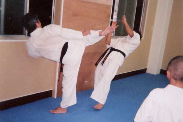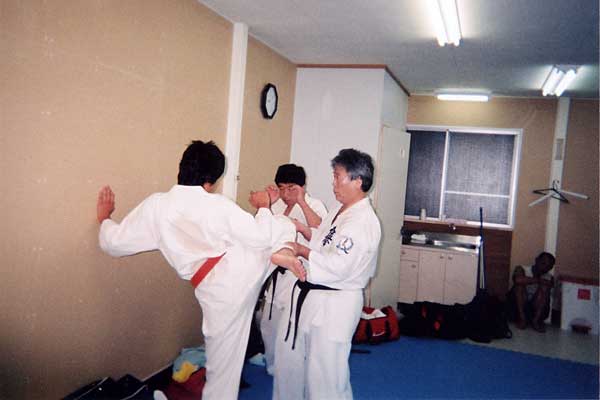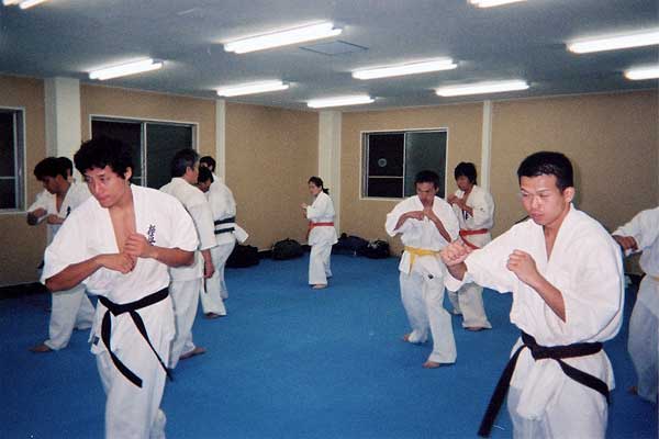 翌日。前日に詳しい説明をしたので準備運動と基本についての説明は簡単に流していった。基本の数は30本で、いくつかの技については100本といった具合に進んだ。基本のあと黙想で呼吸と精神を整え、参加者の希望によりブラジル式上段回し蹴り(ブラジリアンハイキック)の稽古に。まず膝を高く上げ引きつけた状態で膝が下がらないように上体と軸足を返し相手の顔面に縦方向に当たる角度にから膝から先を蹴り込む。言うのは簡単だが実践するのは難しく、なかなかいい線まで出来るのは若い生徒2名ほどだった。しかし2人組でお互いを補助しながら、その蹴り方の難しさを体験できた事は今後に活きることであろう。その後は、いかに突きを効かせられるかという事をテーマに組手立からの稽古に。重心を崩さず腰を切る、肘が外に逃げないよう真っ直ぐ突き出し、前進する時の推進力を利用して威力を増す。この基本を守って正拳突き、下突き、鉤突き、振り突きとパターンを変え比較的易しい組合せから順に複雑なものへと繰り返していった。この時点で時間はすでに10時を回り、最後は稽古についての心構えなど、師範の経験と実践から毎日繰り返す事、その重要性を説かれた。師範自身、毎日2回の稽古は欠かしていないので皆も負けずに出来る限り努力するようにという事、出来ない言い訳を考えず、いかにして出来るようにするかを考えるようにとの内容を力説された。稽古に参加した生徒たちは皆熱心に聞き入っていた。今後も福井に戻った際にはみんなと稽古しに来るよ、との言葉をいただいき2日間に渡った特別稽古は終了した。磯部師範2日間誠にありがとうございました。次の機会にもよろしくお願いいたします。