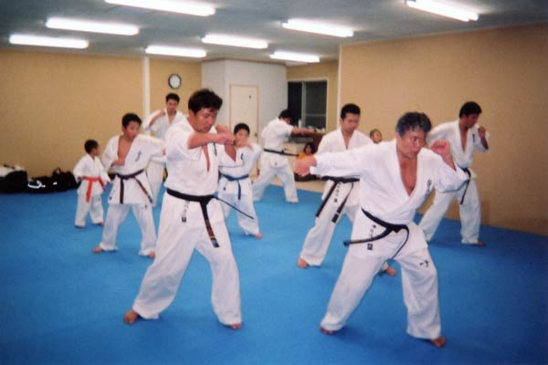 前屈立ちから突き蹴りの移動からはじまり、後ろ回転の移動、後ろ回転からの屈伸蹴りと続き、組手立ちの移動に移った。正拳、下突き、鉤突きを組合わせた6本突き、片足での回し蹴り裏回し蹴りのコンビネーション、5本蹴りなどを参加した一般道場生全員が号令を掛け、出来るだけ多くの回数をこなしていった。