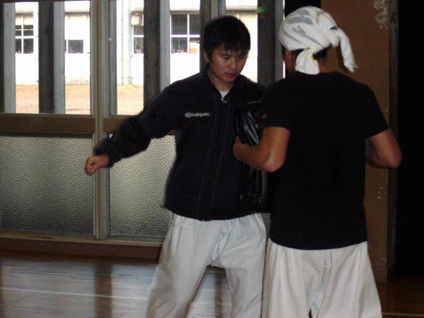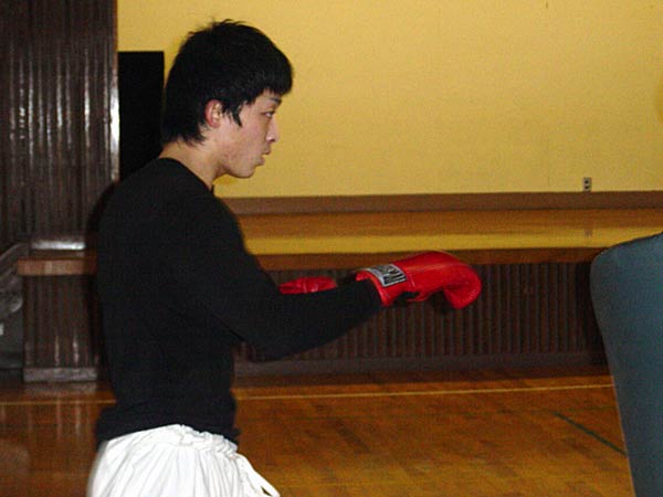 肌を突き刺すような寒さの中、その寒さを吹き飛ばすように、ひたすらミットを打ち込みました。セットをこなすごとに、体も心もヒートアップ。最初は恐る恐る覗いていた町内会の子供たちも、刺激を受けてか廊下でダッシュ。早朝の体育館に大きな気合とミットを叩く音を響かせました。 |