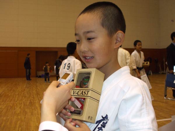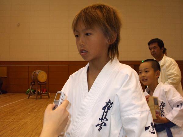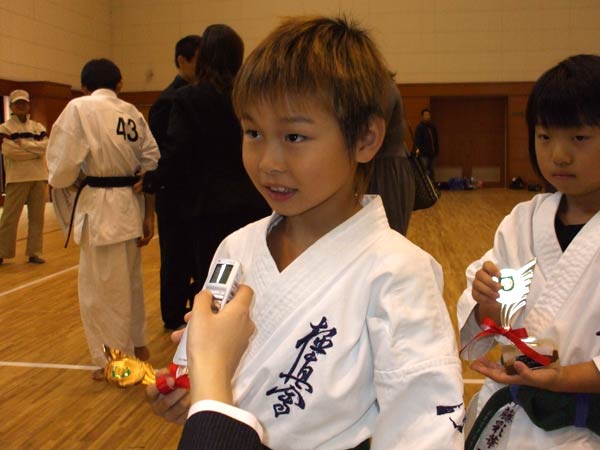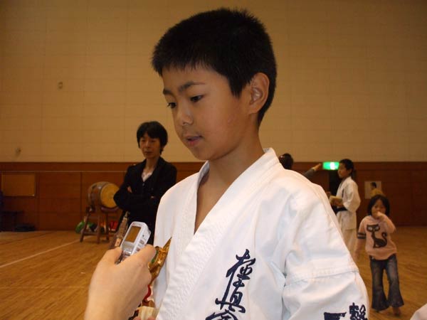 えー、あー、うんと、観空と・・・。それしか知らないんで、それを、観空を。(師範に一言。)えー、どうもありがとうございました。(つつじのみんなにひと言。)つつじ代表で頑張って一応二位でした。はい、来年はもうちょっとそれよりも良いの取れるよう頑張ります。はい。 |