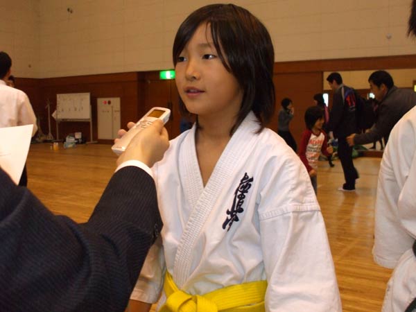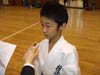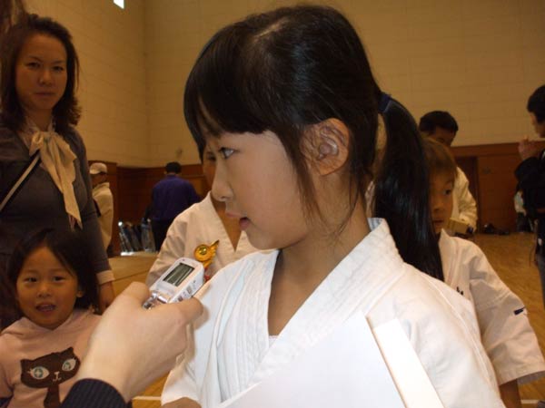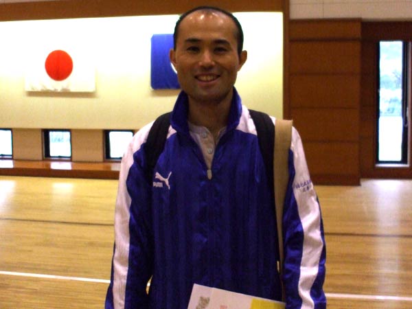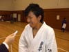 えー、予選の型はまあ、80〜90点くらい。決勝は50点ぐらい、かな?うん。(マイナスは?)ま、決勝に関しては・・・うん、練習不足とあと、小心者なんで、あがってしまって・・・、うん。(いつもより緊張されました?)うんうん、そう。(一番型の試合に出てらっしゃる大島先生でさえも?)緊張するね。父兄の目が、一番緊張するね。どんな型をするのか、といった興味津々の目がもう・・・。うん。 |
