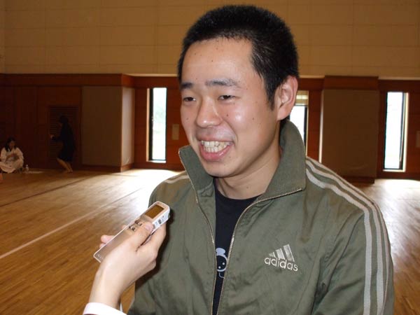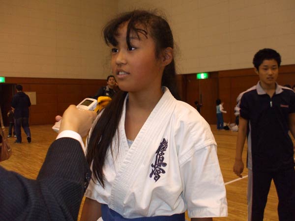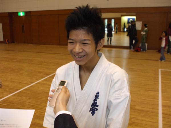 いや、無いです。(もう型はやらないと?)いや、やりますけど、今の所無いです。(決勝は征遠鎮で来るとは思いませんでした。いつ変えたんですか。)1週間くらい前に。(じゃあ1週間前から猛特訓で?)はい。(師範に一言。)宜しくお願いします。(型のライバル藤田さんについてひと言。)頑張りましょう。 |