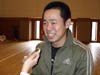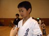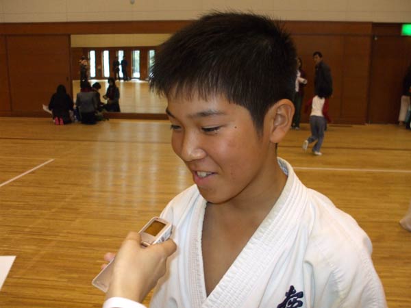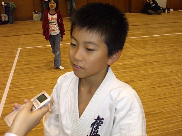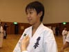 やっぱりね、誰、あれ?って言われるようにしたいなっていうのがある・・・。(これから型の稽古は?)うん、もちろん。組手も頑張って、型も強いなって思われるような型をしたいなと思います。もう、ちょっと今、まじめモード入っているんで・・・。答えがあんまり上手い事出てこなくて・・・。まあでもこれをばねにして頑張るのが自分の取り柄なんで。はい、そういう意味で頑張ります。(来年は?)来年ももちろん。こうやって這い上がっていくのが僕のポリシーやから。はい、頑張ります。うーん、結構落ち込んでるけどね。(生徒さんに一言。)やっぱりまだまだ練習不足がはっきり出てるから、うん。まあ僕の持って行き方も良くなかったんだけど・・・。もっとこれをここで終わらずに、えーと、また同じようにね、くじけずに続けて欲しい。それだけです。うん。ほんとに、ここだけで終わるんだったら出た意味が無いから。また次も次も次も、悔しいと思ったのなら次も、次もなにくそ、勝つまでやってやる。っていうものを持って欲しいっていうのが僕の思ってる事なんです。うん、ね、はい。そういう意味で。 |