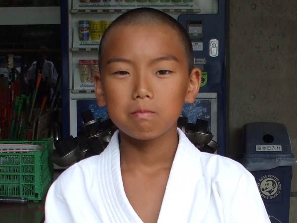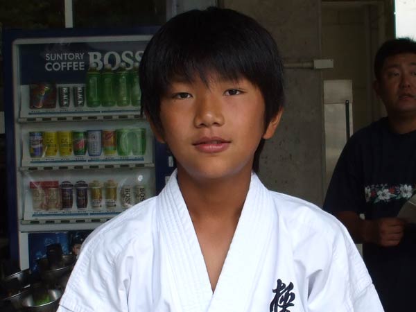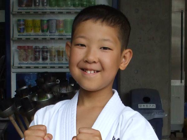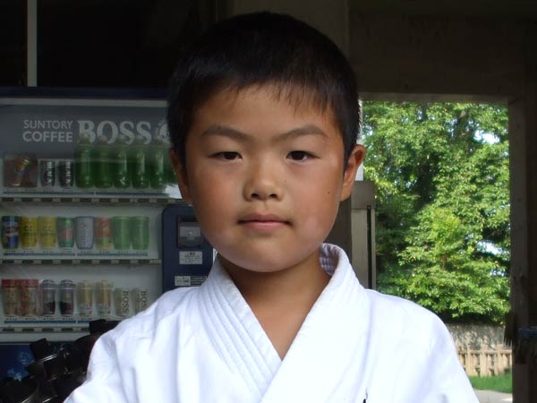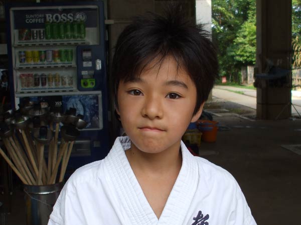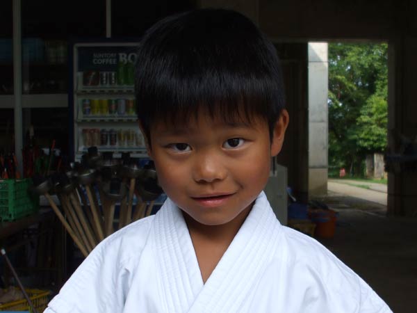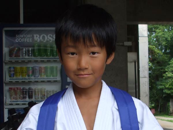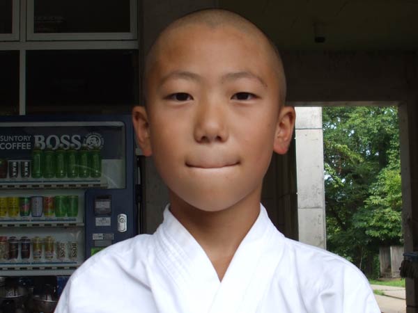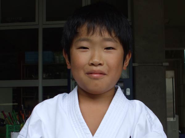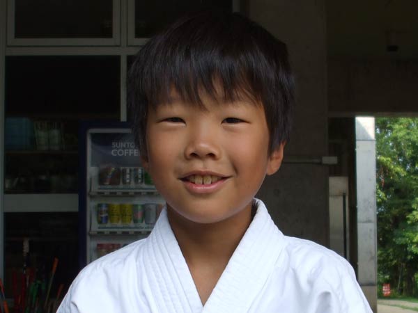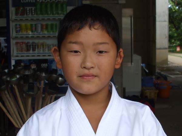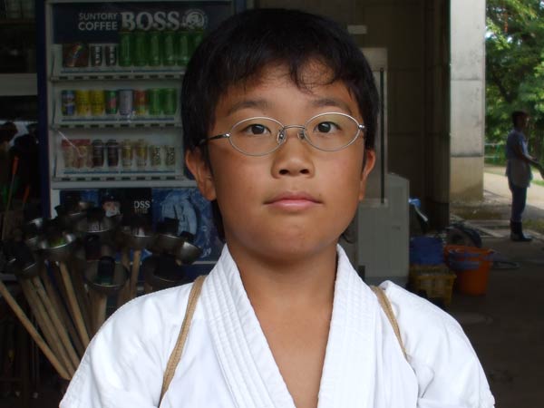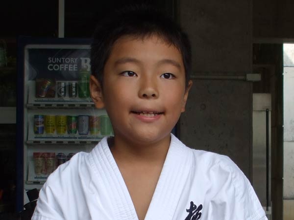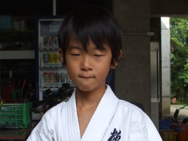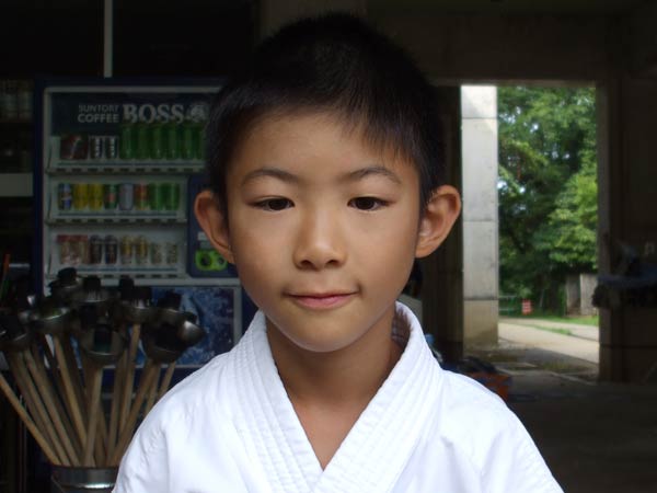 道着に着替え、9時半から体育館で最初の稽古を行った。大島指導員が準備運動の号令をとり、基本稽古から師範の指導となった。みんなまだ目が覚めてないのか、それとも不安があるのか、いまいち元気が無い。そのため、まずは正拳中段突き100本で気合を入れた。その後は20本ずつ進む。だんだんと気合が入って、みんな汗びっしょりに。蹴りも同じく20本で進んでいくが、気を抜くと蹴りの高さと力が落ちてくる。途中指導員から発破をかけてもらいながらがんばり、最後は回し蹴り100本で基本終了。始める前と比べて、かなり気合の入った顔つきに変わっていた。気温も上昇してきたため、一旦ここで休憩。準備されたスポーツドリンクを飲んでちょっと一息。10分休憩後、移動稽古に入った。内容は、前屈立ちでの移動稽古を3種類、蹴りを3種類、後屈を3種類。暑くなってきた事もあってか、動きが緩慢になり、摺足もどたどた言い出してきた。すかさず注意が飛び、全員気を引き締め直す。30分間と少年部にとっては少し長めだったが、みんなしっかり動けていたようだ。ここで再度休憩。暑い中でこれだけ動いたのだからくたびれていそうなものであるが、休憩中はみんなまだまだ元気満々で飛び回っていた。