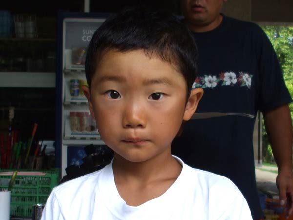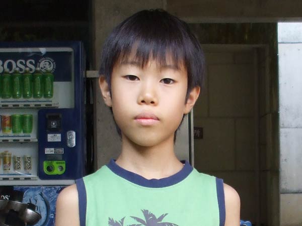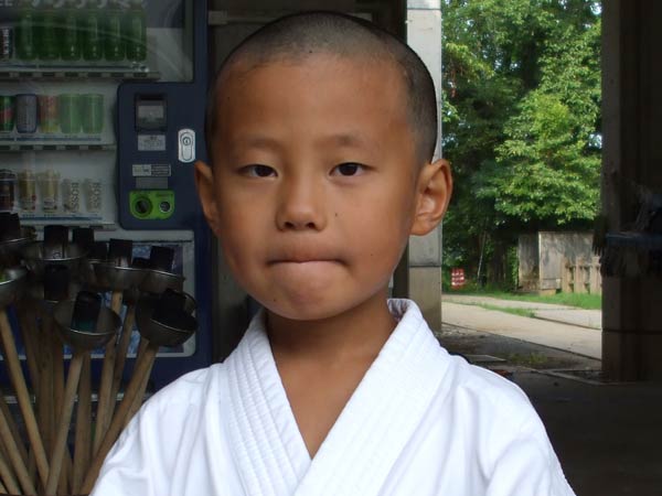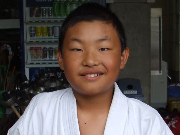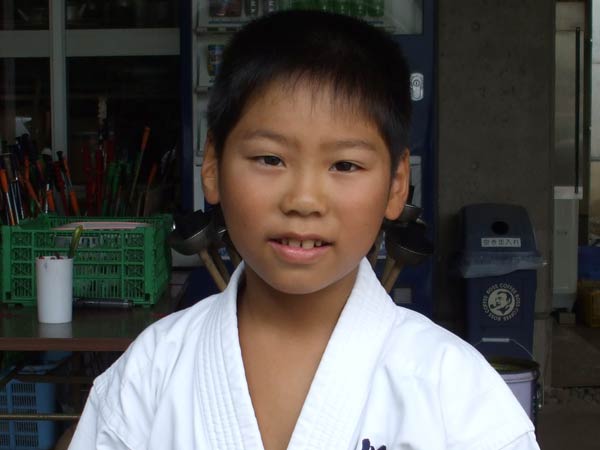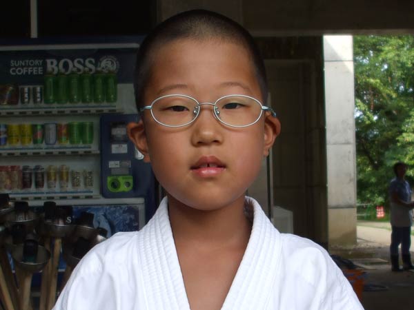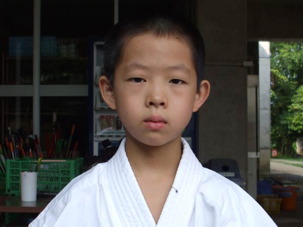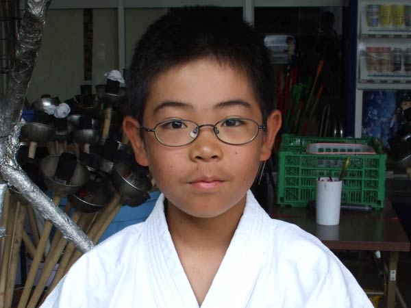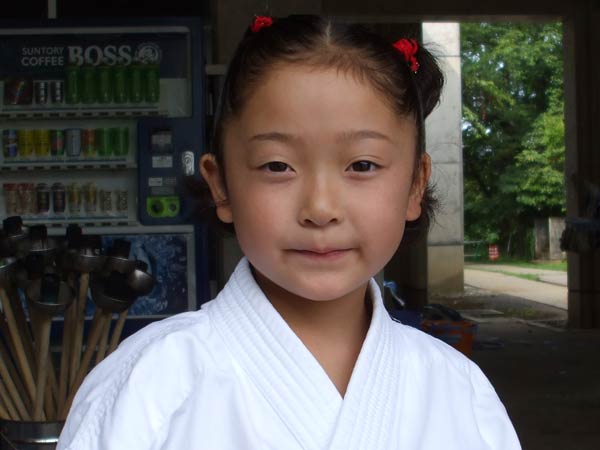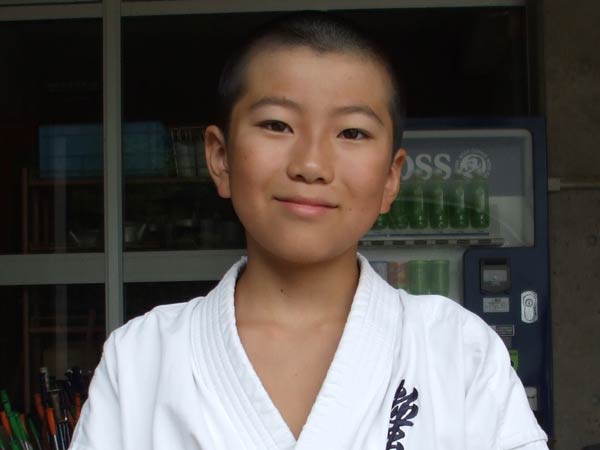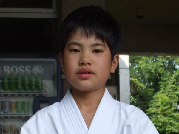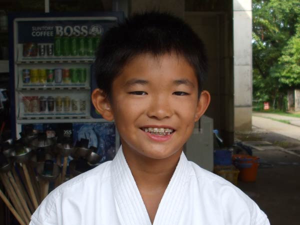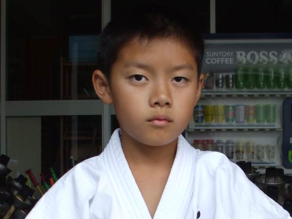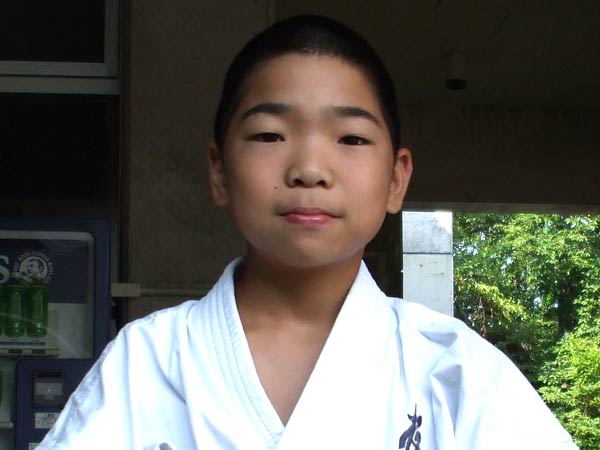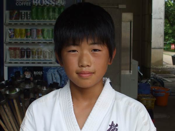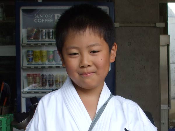 道着に着替え、9時半から体育館で最初の稽古を行った。大島指導員が準備運動の号令をとり、基本稽古から師範の指導となった。みんなまだ目が覚めてないのか、それとも不安があるのか、いまいち元気が無い。そのため、まずは正拳中段突き100本で気合を入れた。その後は20本ずつ進む。だんだんと気合が入って、みんな汗びっしょりに。蹴りも同じく20本で進んでいくが、気を抜くと蹴りの高さと力が落ちてくる。途中指導員から発破をかけてもらいながらがんばり、最後は回し蹴り100本で基本終了。始める前と比べて、かなり気合の入った顔つきに変わっていた。気温も上昇してきたため、一旦ここで休憩。準備されたスポーツドリンクを飲んでちょっと一息。10分休憩後、移動稽古に入った。内容は、前屈立ちでの移動稽古を3種類、蹴りを3種類、後屈を3種類。暑くなってきた事もあってか、動きが緩慢になり、摺足もどたどた言い出してきた。すかさず注意が飛び、全員気を引き締め直す。30分間と少年部にとっては少し長めだったが、みんなしっかり動けていたようだ。ここで再度休憩。暑い中でこれだけ動いたのだからくたびれていそうなものであるが、休憩中はみんなまだまだ元気満々で飛び回っていた。