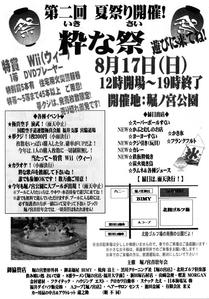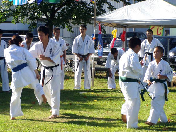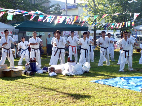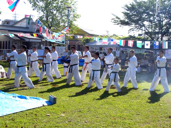 8月17日(日)夕方4時より福井市堀ノ宮公園で開催された「粋な祭」で極真空手演武を披露した。前日まで雨模様で開催が心配されたが、当日は朝から良く晴れ、また暑さも一段落といった感じで気持ちよく演武は進んだ。