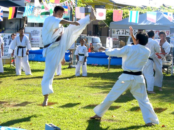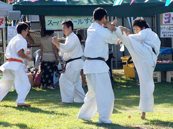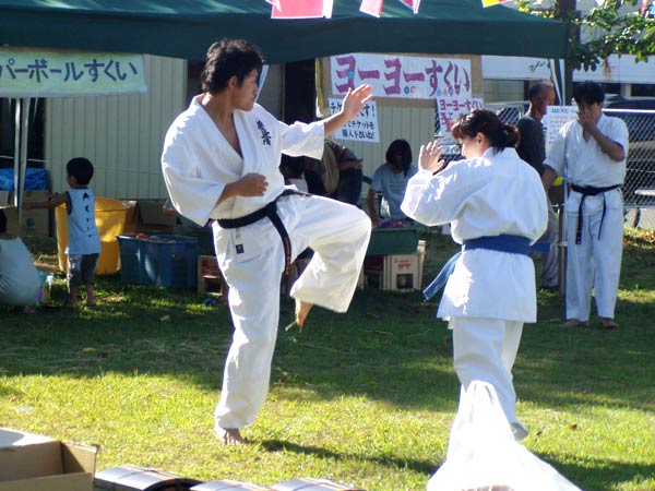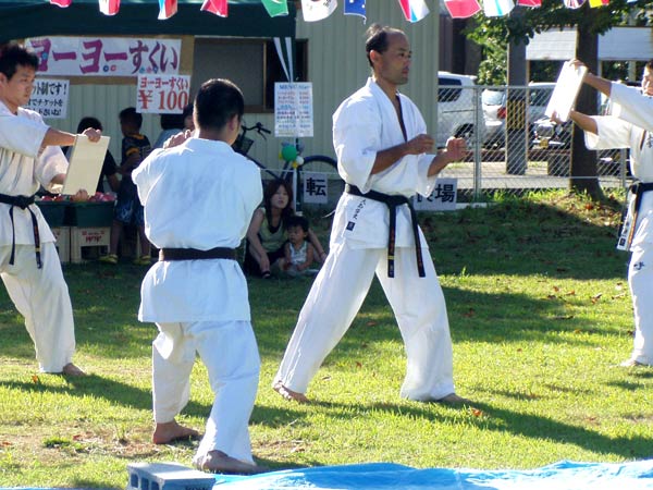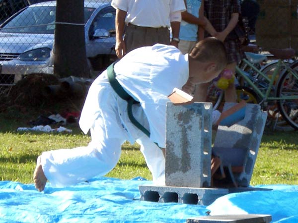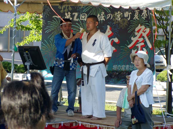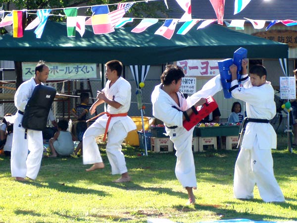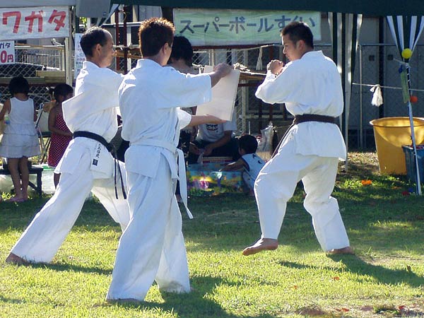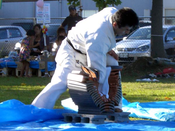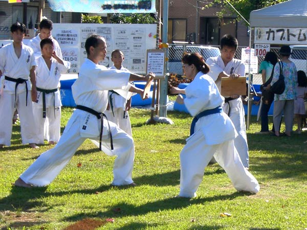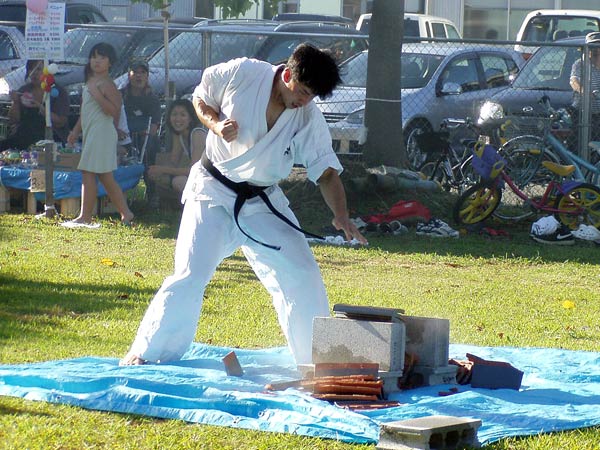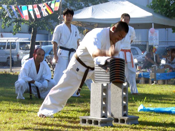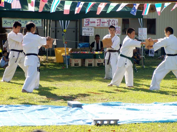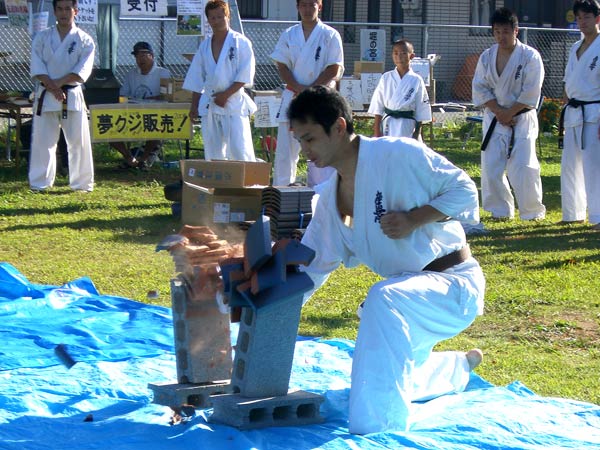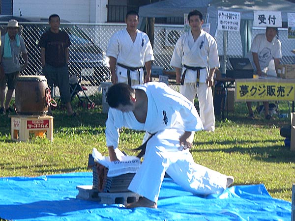 氷の後は再び瓦割り。西岡指導員による手刀10枚、ただし油を撒いて火がついた状態のものを割る。炎があがるとざわめきが起こったが西岡は動じることなく破壊。さらに前川指導員による頭突き10枚割り。これも周りの心配をよそにあっさりと粉砕し喝采を浴びていた。