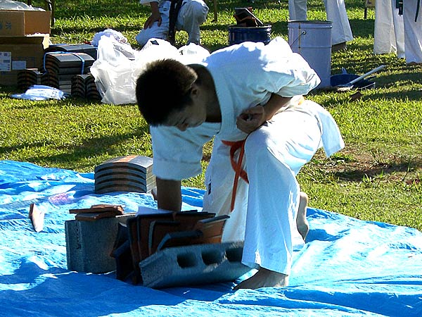 荒業が続いた後は少年部2名が瓦割に挑戦。玉川と宮川が3枚に挑む。玉川が気合もろとも成功すると、負けじと宮川も気合を入れ無事成功した。