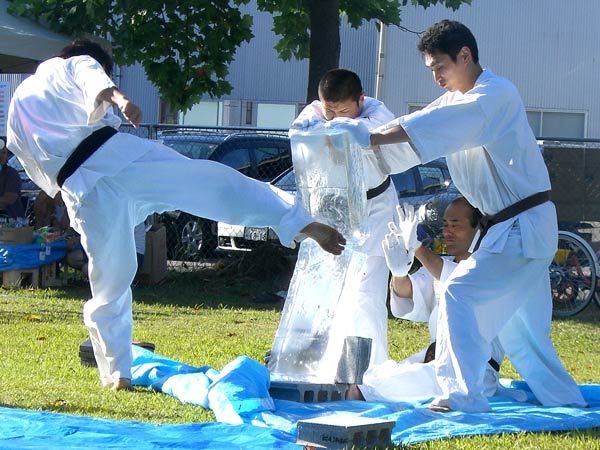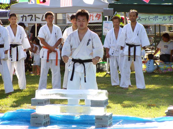 ここで、一際目を引く氷柱が登場。大きな氷を見て観客の期待感も膨らむ。まずは前野指導員が下段回し蹴りでへし折り、次に梅田指導員が氷柱2本を積み上げ手刀で叩き折った。氷柱割りなど初めて見る人ばかりとあってこの日最高の賞賛を浴びていた。