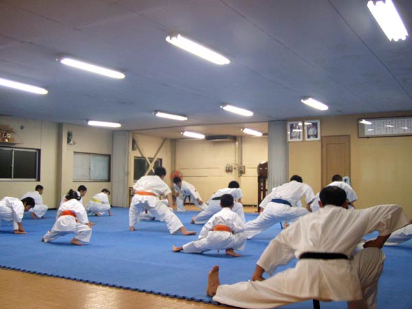 基本後正座黙想をはさみ、基礎体力と技のスピード、手数を鍛えるため、その場での連続突き連続蹴りの稽古に移った。肩幅に立ちその場で素早く足踏みをしながら同時に小刻みに両拳を正面に突き出す。突きは縦拳、下突き、鍵突きと3種類をそれぞれ順に30秒間、合計1分半。言葉で言うと簡単だが、可能な限りペースを上げて行おうとすると全身運動のため、かなりきつい。縦拳の時点でみんな表情が苦しそうであった。3セット終了後、蹴りに移った。その場で片足連続蹴り。前蹴り、回し蹴り、前蹴りと回し蹴り交互、をそれぞれ20秒ずつ。これはさすがに突き以上にきつい。この日参加した者の中で1分間追い込めた者がいたかどうか。右、左と両足で各2セット。この突きと蹴りの稽古だけでふくらはぎと太腿がガクガクするほどであった。