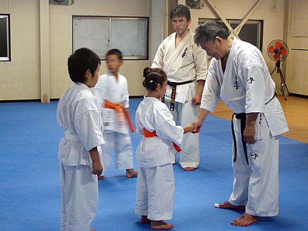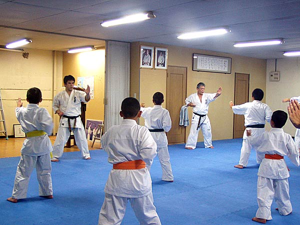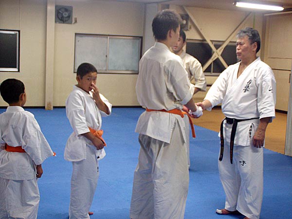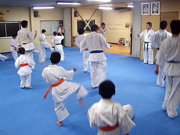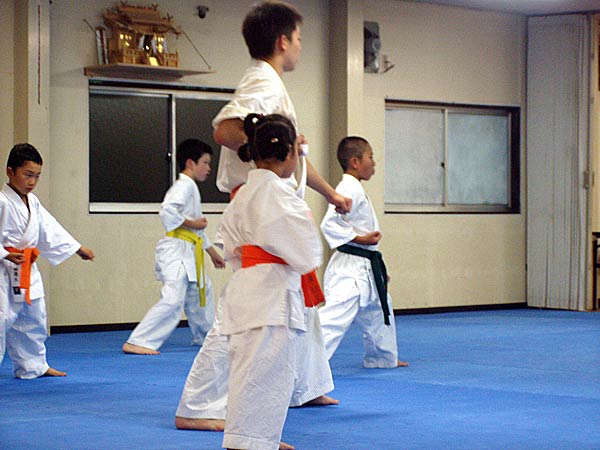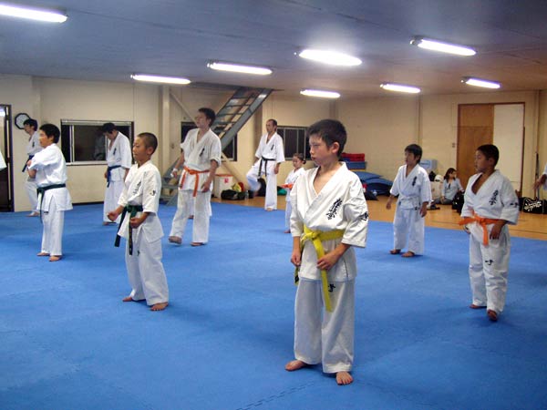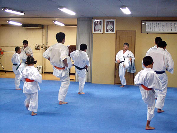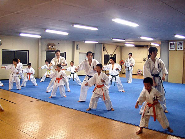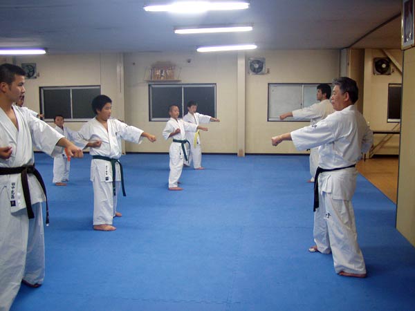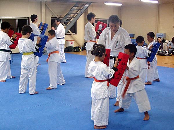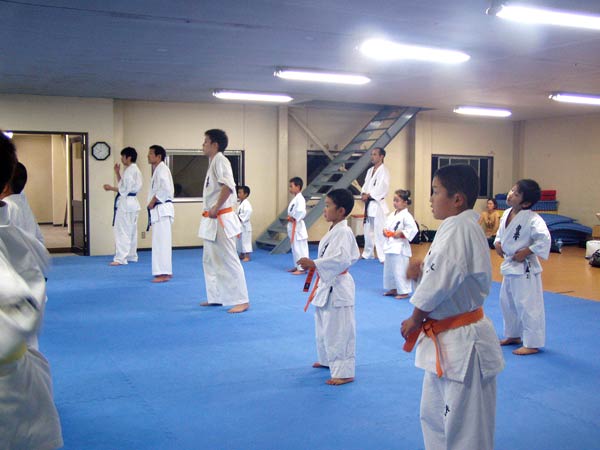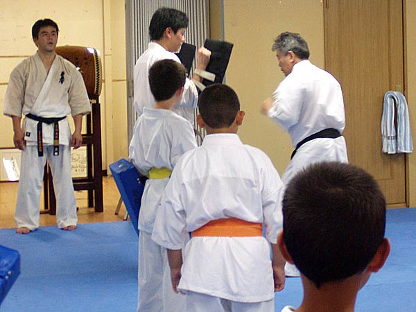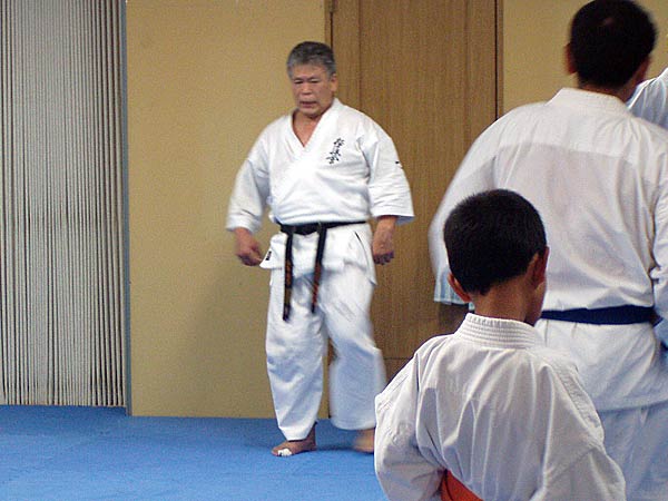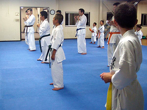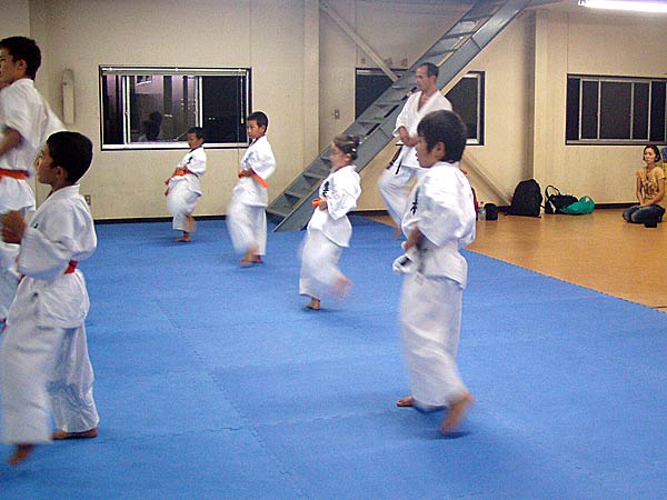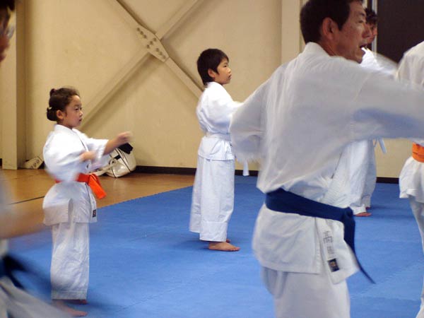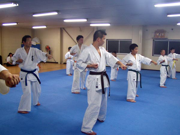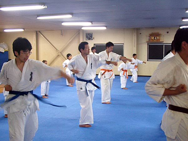 今回は2時間という限られた稽古の中なので要所だけを説明しながら早いテンポで基本が進んでいった。一般部と少年部合同であったが、基本は多いものは100本、少ないものは20本から50本で進み、時折特に早いテンポにしたり、途中からリズムを変えたりとメリハリの利いたやり方であった。