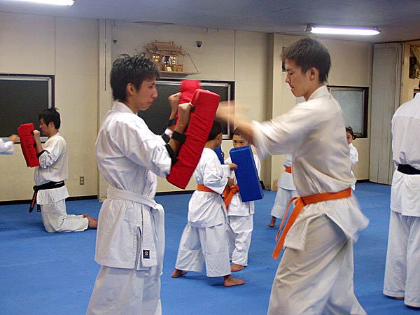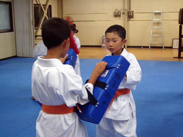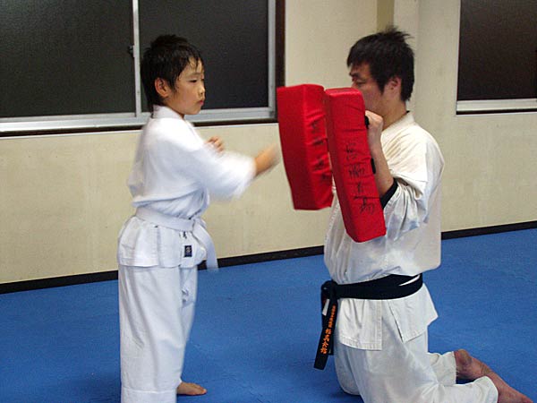 最後はミット稽古。一方が両手にミットをはめ、もう一方が前手で正拳突き、そのあと前手、後手でワンツーを打つ。最初の正拳を1本から10本まで増やして行き、その後また1本まで減らしていくというやり方。左手を前でやったあとは右手を前に変えて同様に行う。突きが大振りになったり雑になってくると磯部師範から注意が飛び、みんなに気合が入る。時間をみると早くも9時近くに。最後は同じ要領で中段回し蹴り、左右の下段蹴りで中段回し蹴りを1本から10本まで増やし1本まで戻す。それぞれ早い遅いはあるが全員最後まで、少年部も誰一人脱落することなく全てやり終える事ができた。