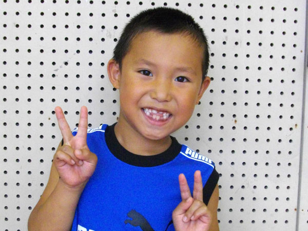 昼休みを挟んで1時からは学習の時間。最初に福井大学の先生が用意した資料で頭の体操を行なった。模様や色、図形などを見ているときは脳がいままでの経験をもとに処理したり、回りの色などから判断をしてしまうために目の錯覚をおこす、ということを資料にある図形を切り抜いて自分の目で確認したり、プロジェクターの映像を見て体験したりして驚いたり納得したりしていた。40分ほどそういった頭の体操を行なった後、休憩をはさんで自分達が用意してきた夏休みの宿題などの勉強に移った。大学生が4名手伝いに来てくれ、わからない問題があればヒントを教えてもらいながら3時まで熱心に勉強をした。