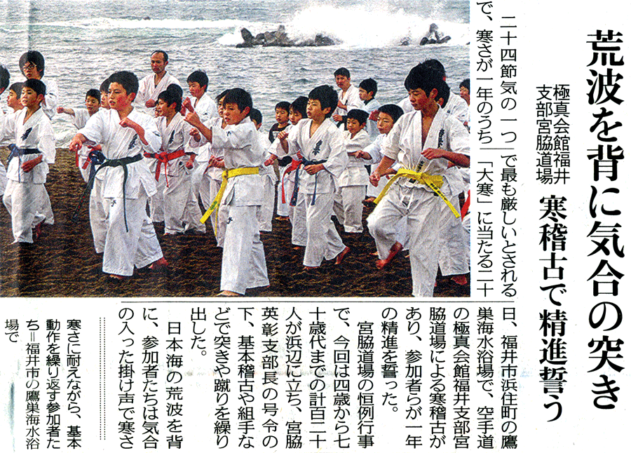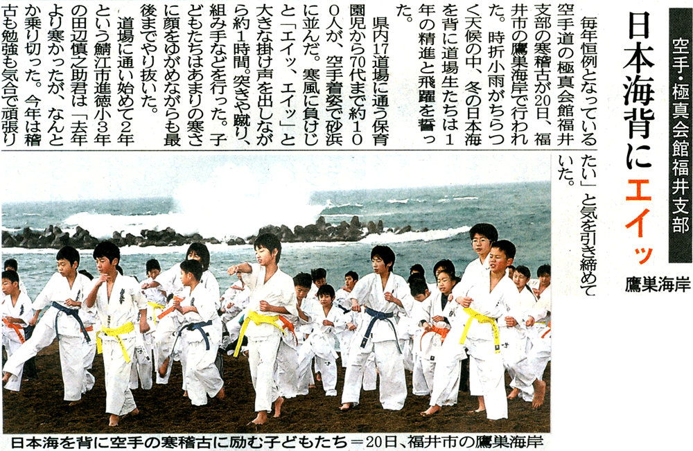 福井支部は1月20日(日・大寒)に福井鷹巣海水浴場にて毎年恒例の寒稽古を行った。
